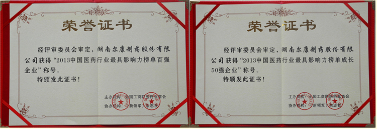 爾康制藥榮獲2013年度中國醫藥行業(yè)最具影響力榜單“百強企業(yè)”、“成長(cháng)50強”殊榮