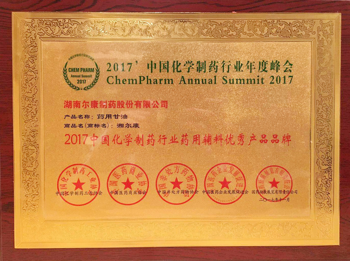 2017中國化藥行業(yè)藥用輔料優(yōu)秀產(chǎn)品品牌—藥用甘油