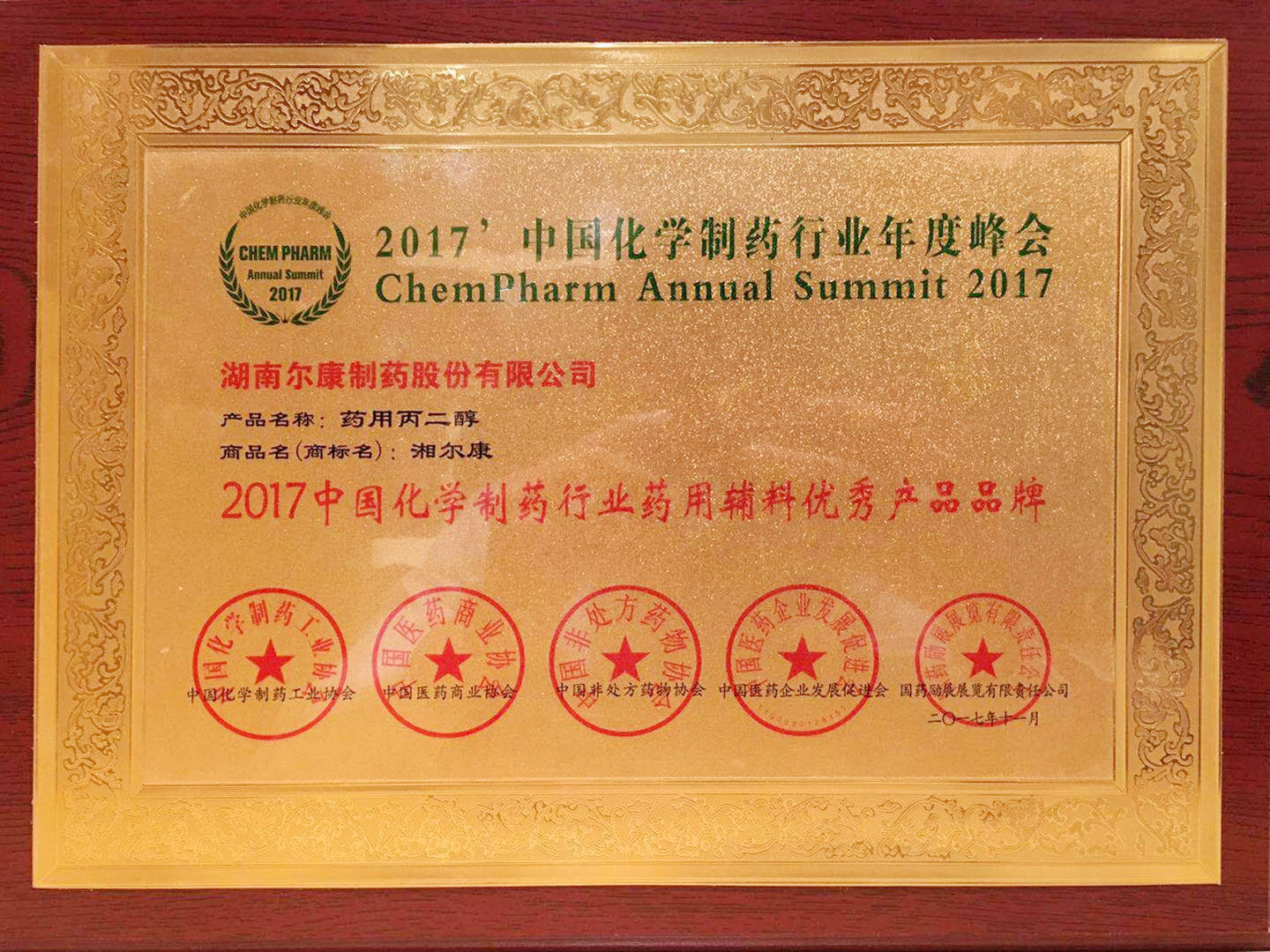 2017中國化藥行業(yè)藥用輔料優(yōu)秀產(chǎn)品品牌—藥用丙二醇