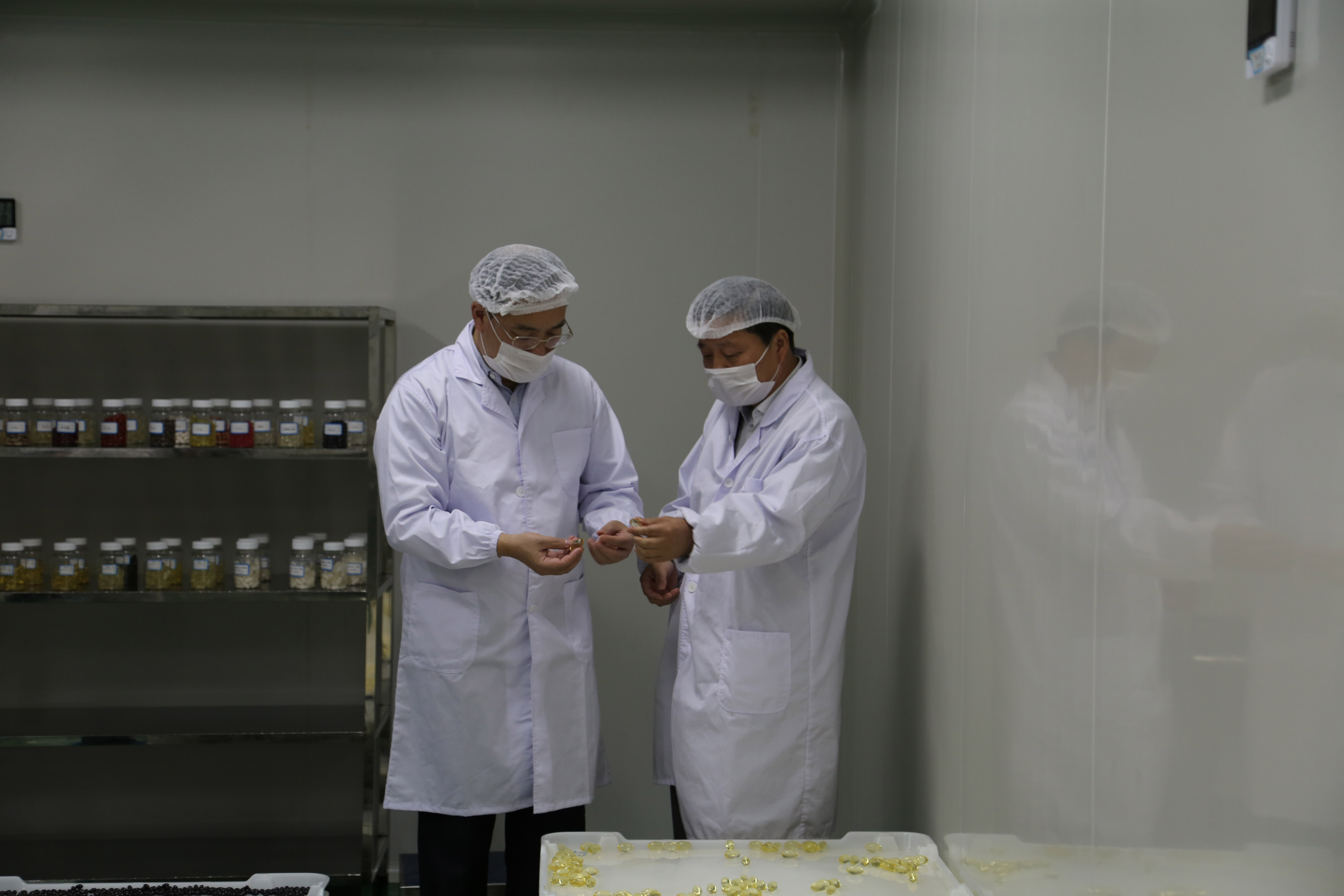 秦裕輝書(shū)記仔細查看爾康制藥淀粉軟膠囊樣品