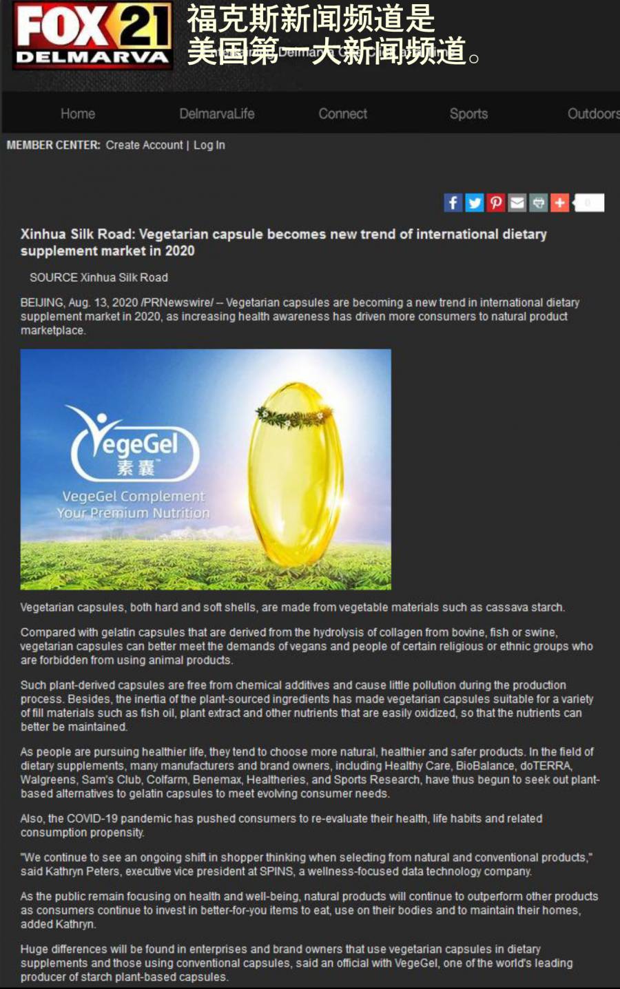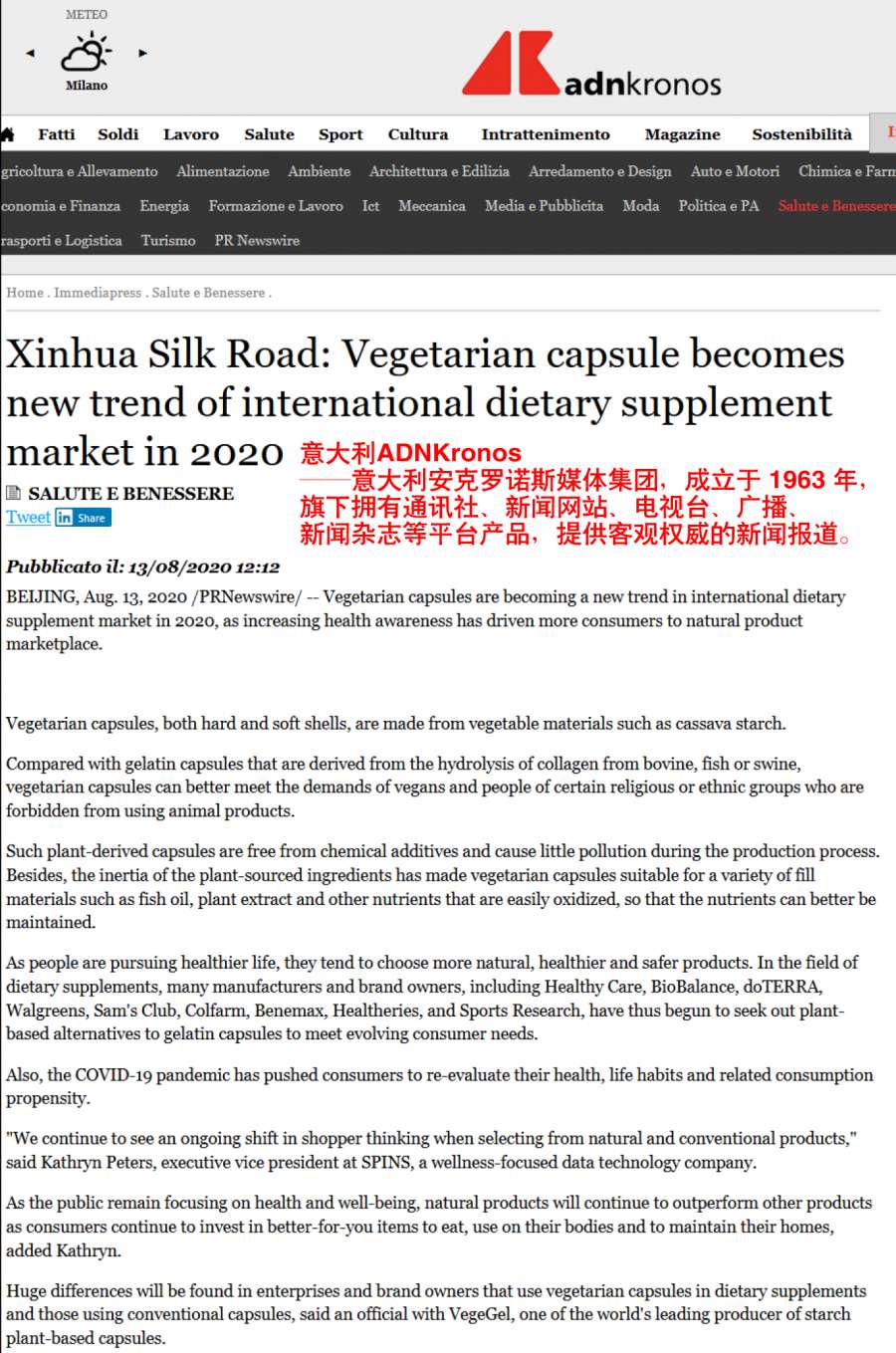 日前,植物膠囊在國際上再度引起關(guān)注,一篇題為《Vegetarian capsule becomes new trend of international dietary supplement market in 2020》探討淀粉植物膠囊或成2020年膳食補充劑新趨勢的文章,被北美Fox、Yahoo! Finance、Business Insider: Markets Insider 、Seeking Alpha、Canadian Business Journal,歐洲Xpert、Notre Siècle、FinanzNachrichten.de、ADNKronos 、Europa Press 、PAP等超40余國家、全球近900家國際媒體轉載發(fā)布。