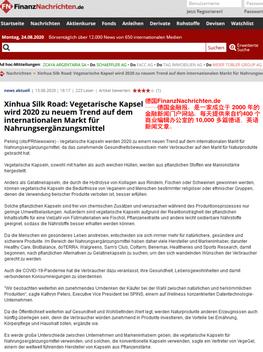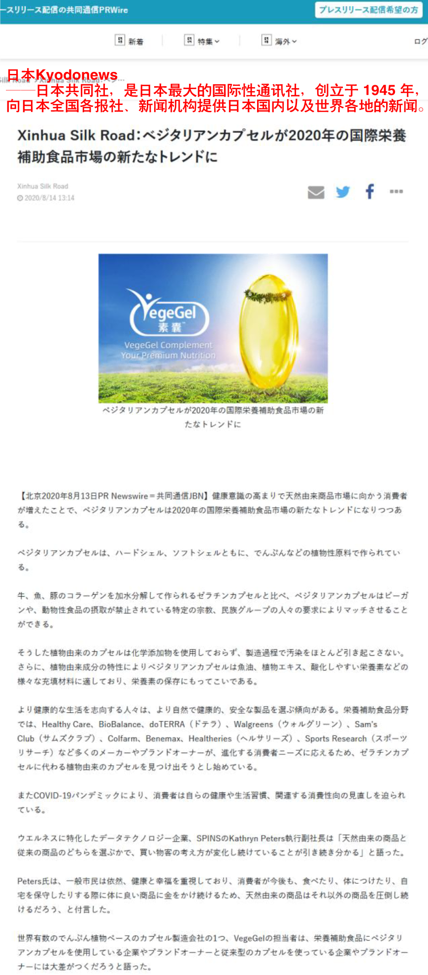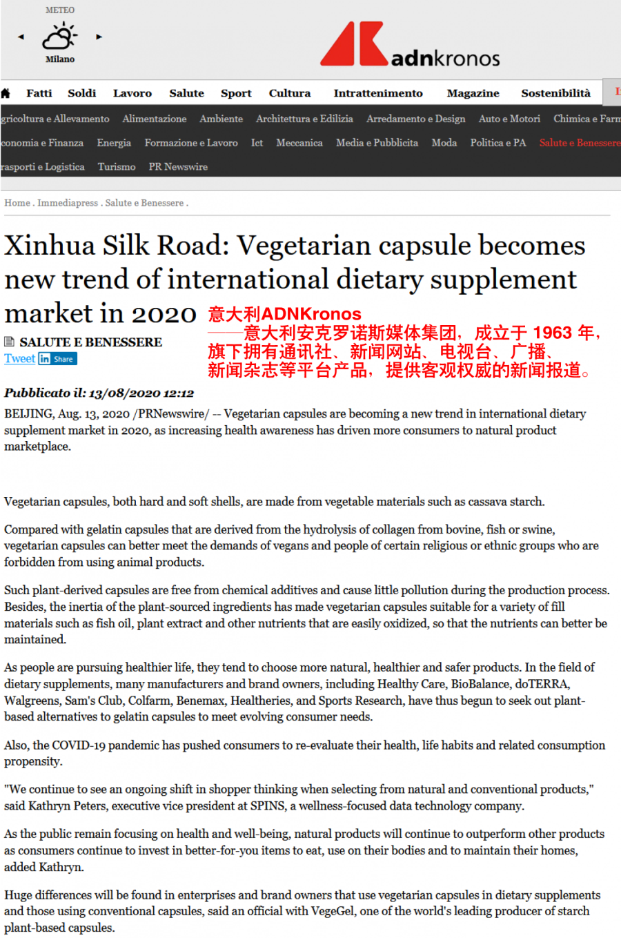 日前,植物膠囊在國際上再度引起關(guān)注,一篇題為《Vegetarian capsule becomes new trend of international dietary supplement market in 2020》探討淀粉植物膠囊或成2020年膳食補充劑新趨勢的文章,被北美Fox、Yahoo! Finance、Business Insider: Markets Insider 、Seeking Alpha、Canadian Business Journal,歐洲Xpert、Notre Siècle、FinanzNachrichten.de、ADNKronos 、Europa Press 、PAP等超40余國家、全球近900家國際媒體轉載發(fā)布。