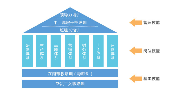 公司根據員工的職業(yè)生涯發(fā)展及崗位技能要求,有科學(xué)先進(jìn)的培訓體系,分別為:新員工入職培訓、在崗帶教培訓(導師制)、崗位專(zhuān)業(yè)培訓、班組長(cháng)培訓、中、高層干部培訓、領(lǐng)導力培訓等。并擁有現代化的培訓室、公司內、外部資深培訓師,能滿(mǎn)足不同層級員工的技能需求。